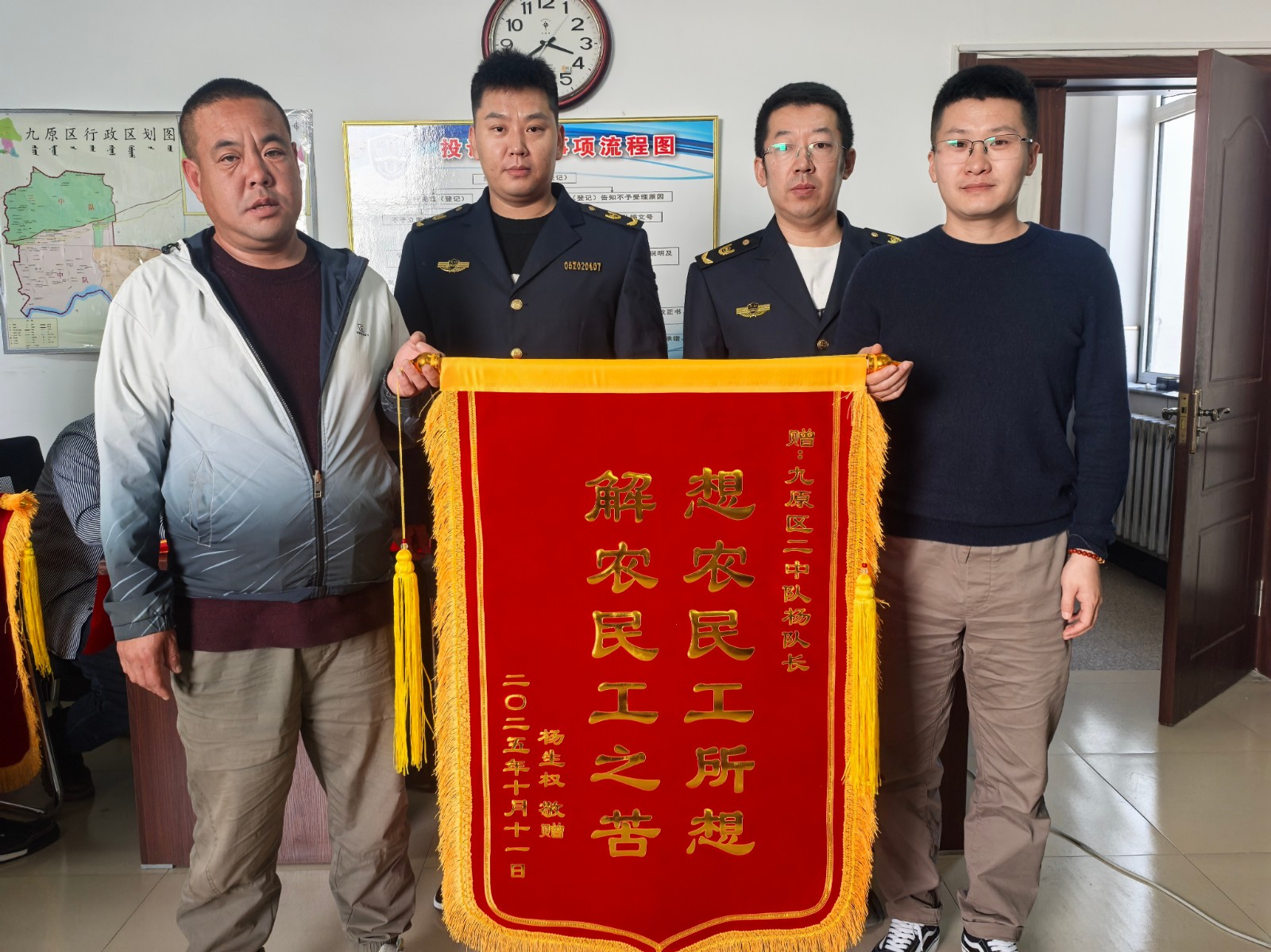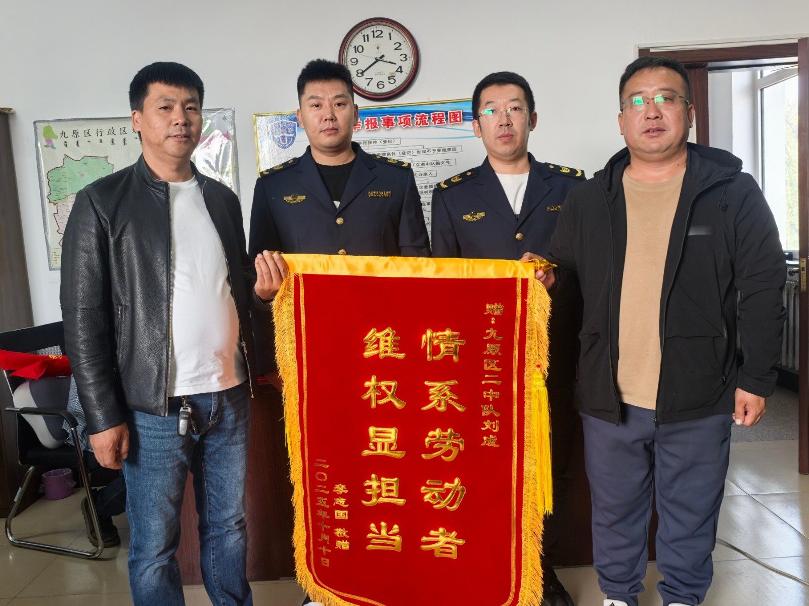 工人们将精心制作的两面锦旗送到执法人员手中,锦旗上“秉公执法护民工 倾心调解暖人心”“为民工排忧解难 做人民满意公仆”的金字,承载着他们对劳动监察部门担当作为的诚挚谢意。