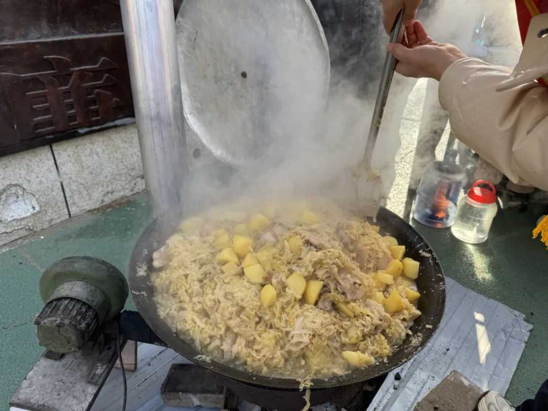 秧歌表演结束后,传统杀猪菜品尝环节正式开始,社区提前准备好的大锅早已热气腾腾,精心炖煮的杀猪菜香气四溢,酸菜醇厚,五花肉肥而不腻,汤汁浓郁。工作人员与志愿者有序分工,为排队等候的居民逐一盛上这份冬日暖肴。居民们围在一起,或站或坐,手捧热乎乎的碗筷,品尝着地道的家乡味道。大家一边享用美食,一边畅叙邻里情谊。热气腾腾的杀猪菜,驱散了冬日的严寒,更温暖了每一位居民的心。许多居民表示,“这吃的不仅是菜,更是人情味,是久违的社区热闹劲儿”。