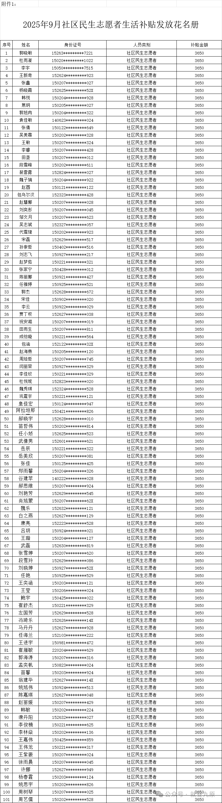 九原区关于发放2025年9月社区民生志愿者生活补贴的公示