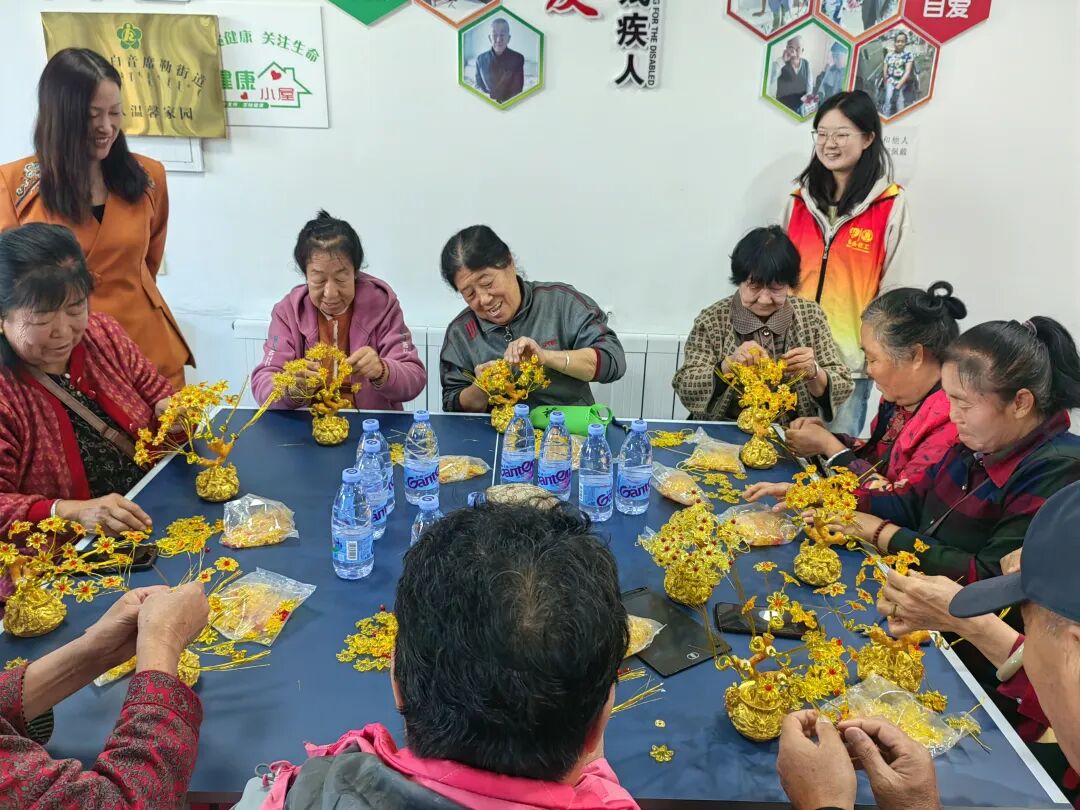 随着社交环节告一段落,活动进入了核心部分——“发财树”手工制作。老师逐步演示如何将斑斓的花瓣、精巧的花蕊、象征吉祥的铜钱、闪亮的金属丝与小元宝等材料,组合成一盆盆寓意美好的“发财树”。在老师与志愿者的耐心协助下,残疾朋友们全情投入,每一个动作都饱含着对美的追求与对生活的热爱。渐渐地,“发财树”的形态愈发丰满,大家的笑容也愈发灿烂。一盆盆独具匠心的作品在欢声笑语中诞生,它们不仅是手工作品,更是残疾朋友们用心编织的希望与安康。