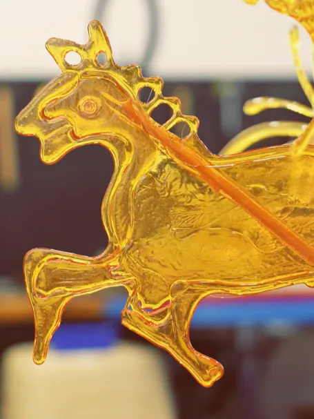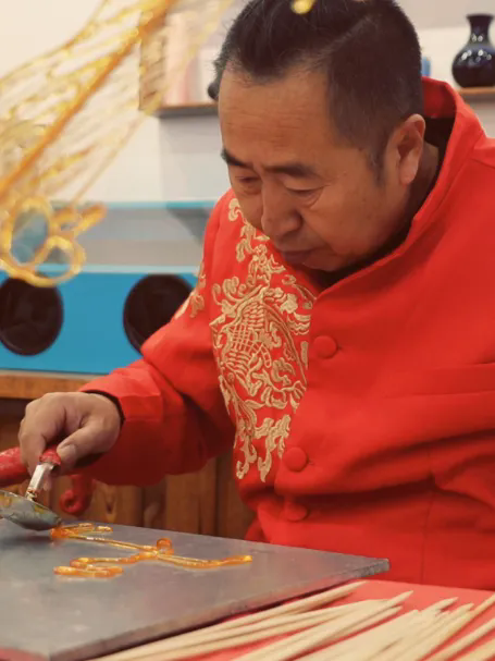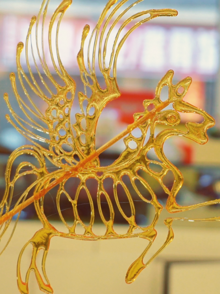 今年是王师傅做糖画的第17个年头。对他来说,这不仅是一门手艺,更是珍贵的回忆。“熬糖是糖画的灵魂,火大了会焦,火小了图案不成型,这其中的分寸,全凭十几年的眼力。”以铜勺为笔,以糖液为墨,石板就是画纸。趁热流淌的琥珀色糖浆,在传承人手腕的微微抖动中,勾勒出马匹强健的线条,透明的糖质在阳光下泛着金光,仿佛给骏马披上了金色的战甲。