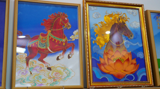 掐丝镶嵌宝石画是一门极尽精细的手艺,手艺人需用镊子将扁细的金丝粘成千上万的段落,在板材上掐出骏马的轮廓。无论是写实的奔马,还是富有创意的图腾马,那凸起的金丝线条本身就构成了马匹强健的骨骼与肌肉纹理,随后的上色环节,再用颜料填充出马匹的色彩渐变,更精妙处,还会镶嵌打磨好的天然宝石作为马的眼睛或装饰,让马儿瞬间“点睛”,栩栩如生。