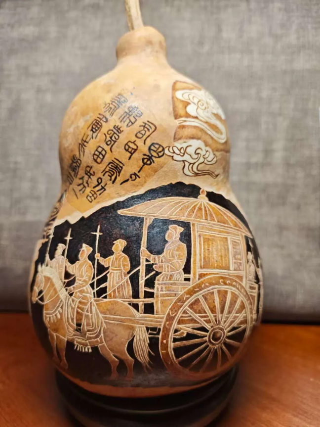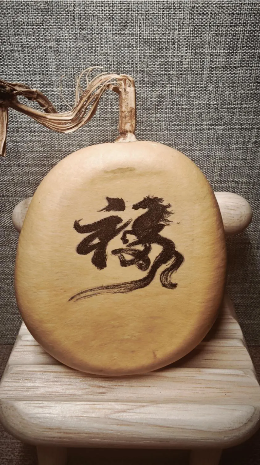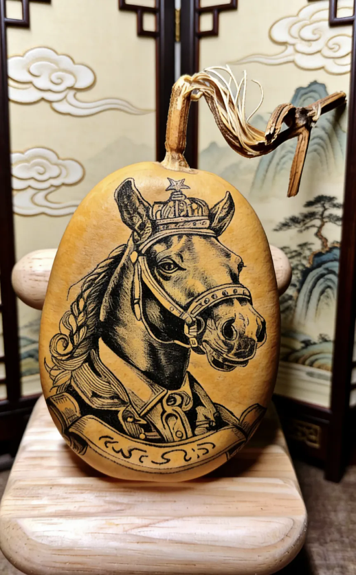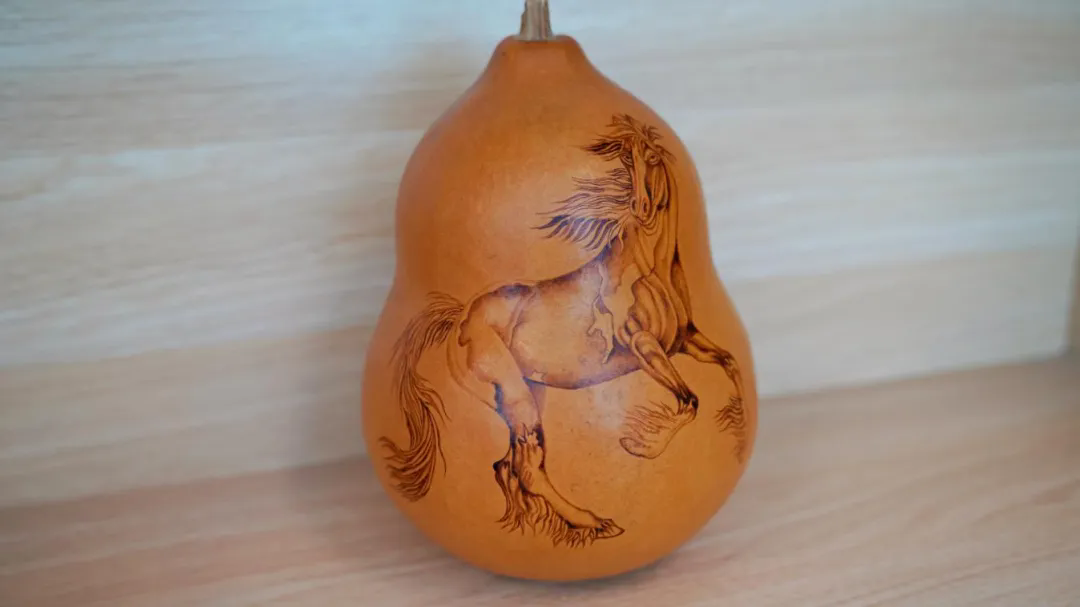 绘制“马”时,艺人需精准控制烙笔的温度与走笔的速度,利用碳化程度的不同呈现出深浅不一的褐色调。在葫芦圆润且不规则的表面上,要画出马匹的身姿极为困难,但高手却能借着葫芦的天然弧度,顺势烙出一匹昂首嘶鸣的烈马,这种温润的木质色调,让马的形象显得既古朴又充满力量。