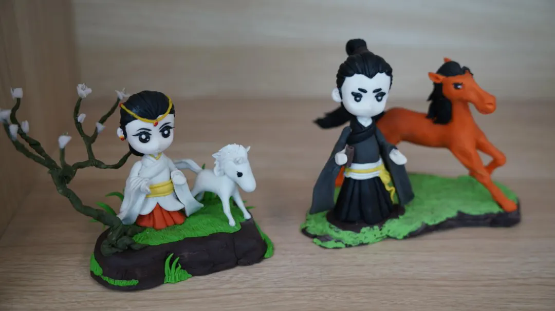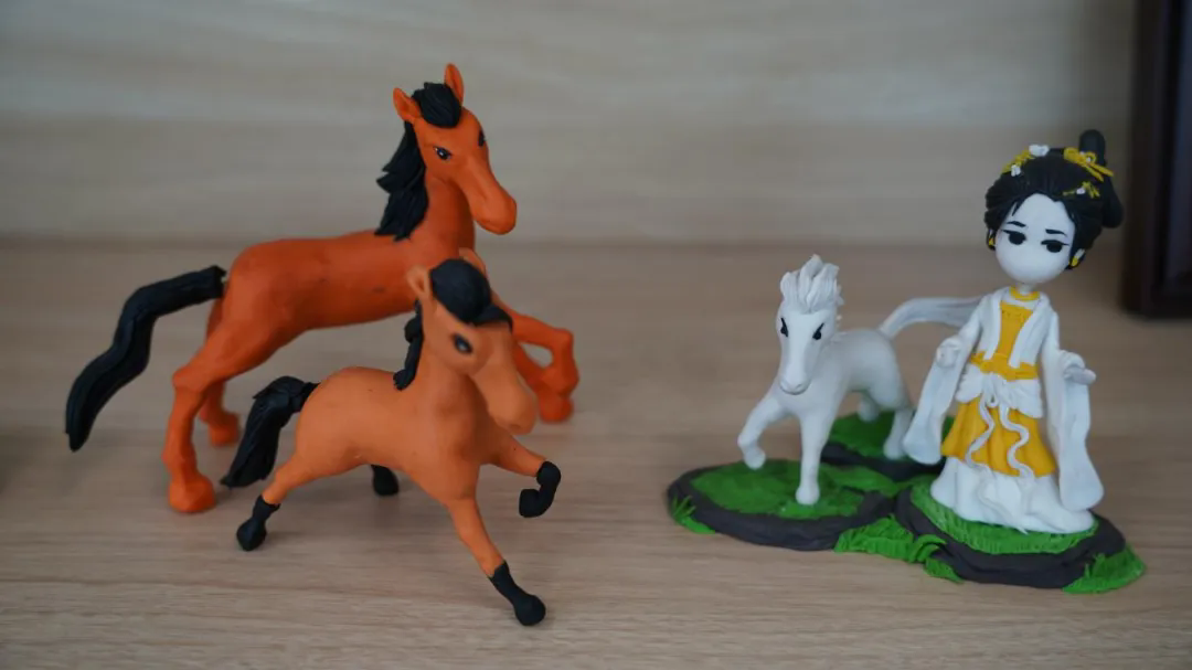 两匹马儿相依而立,马身线条饱满圆润,一静一动间,是并肩同行的默契。古装孩童,眉眼弯弯,围着一匹憨态可掬的小马。女孩的裙摆捏出细碎的褶皱,男孩的袖口留着浅浅的指痕,小马身上还印着掌心的温度。