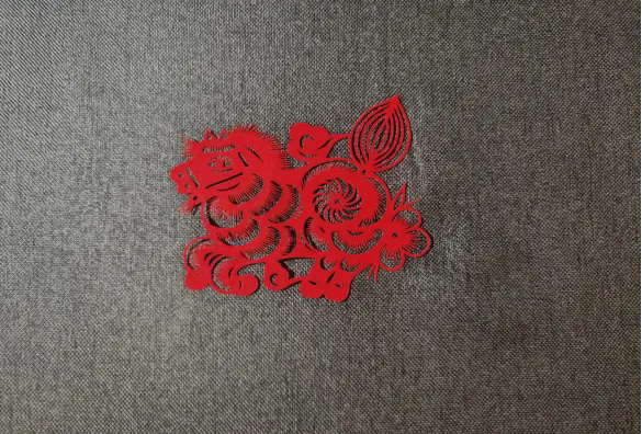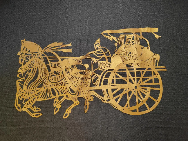 剪刀游走于锦缎之上,锋刃过处,一匹红马从缎面中跃出,马首高昂,鬃毛飞扬,通体赤红如烈焰,仿佛正迎着朝阳奔腾。金色的马车辚辚而行,马匹身姿矫健,车夫执缰,车内人影依稀可辨。剪刻之间,锦缎的华美与刀工的利落相得益彰,一静一动,皆是匠心。锦缎剪刻,剪出的是马的形象,留下的是吉祥的期许。