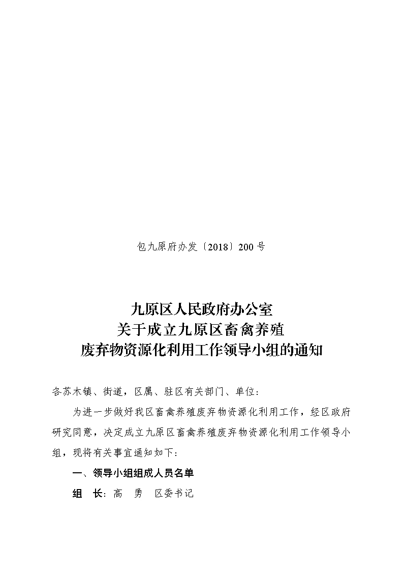 关于成立九原区畜禽养殖废弃物资源化利用工作领导小组的通知